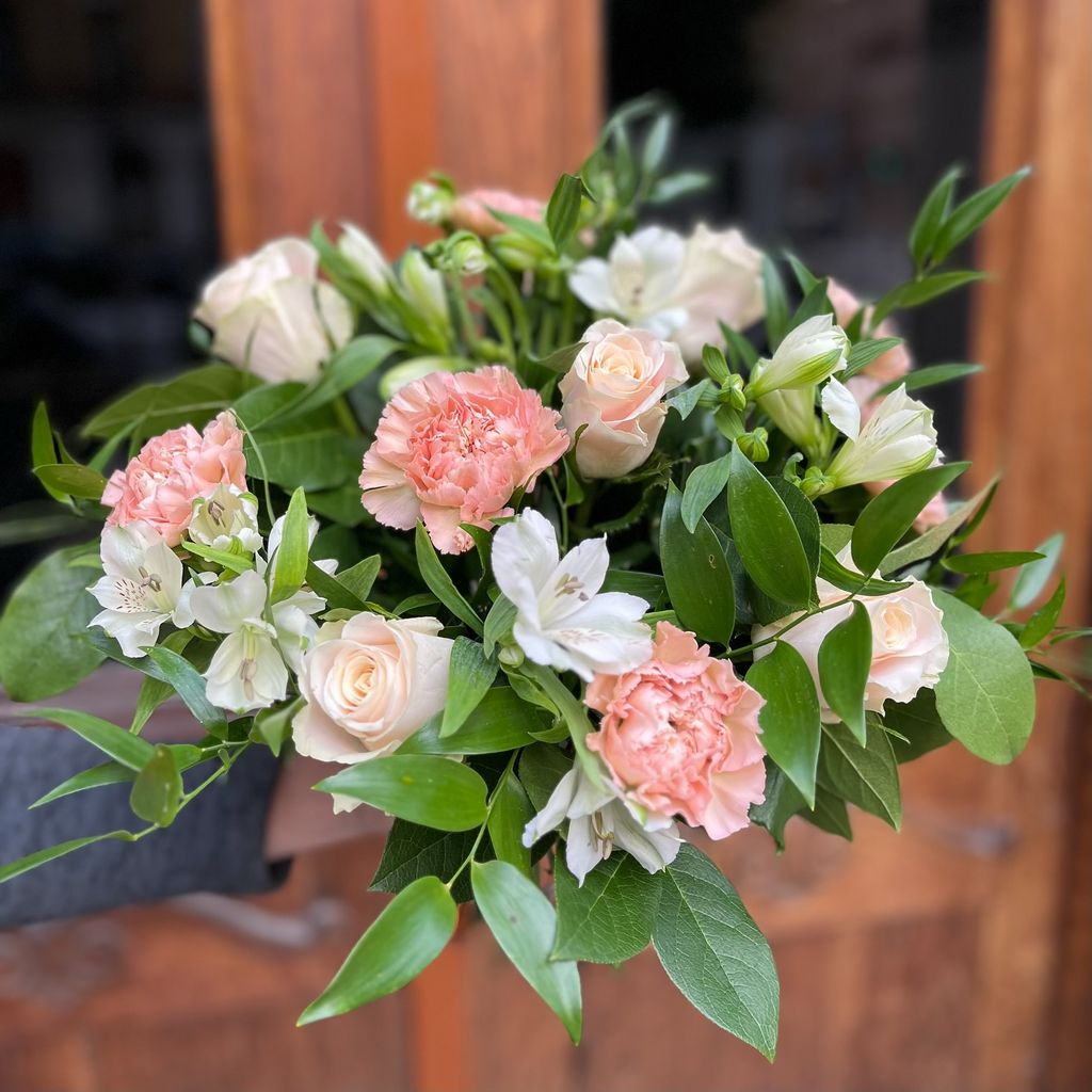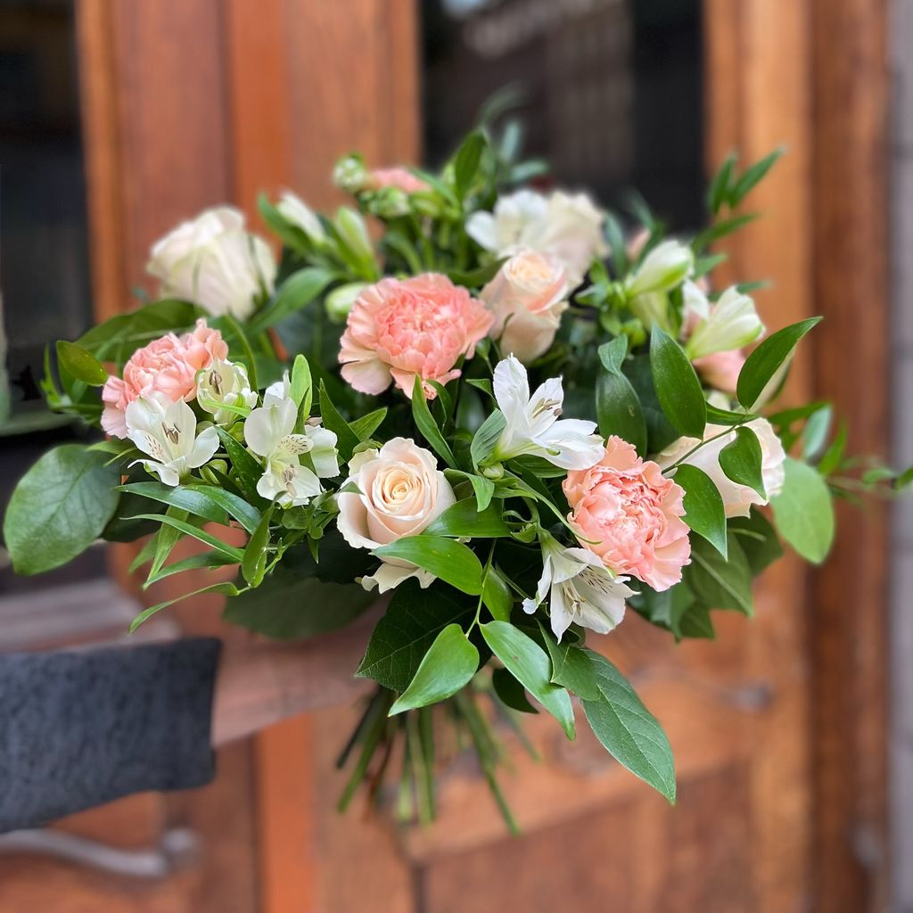 Skicka blomsterbud för att visa extra omtanke till din bästa vän, kollega eller någon som betyder mycket för dig. Ljuvliga creme färgade nejlikor tillsammans med vit alstroemeria ger denna eleganta bukett en harmonisk och inbjudande känsla. En ljuvlig bukett, perfekt när du vill visa omtanke och uppskattning.