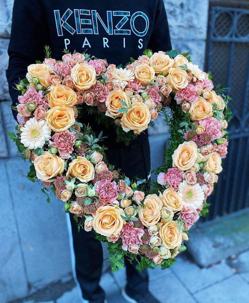 Ett vacker öppet blomsterhjärta med rosor och blandade blommor i aprikos och creme tillsammans med vackert grönt. En vacker och personlig hyllning vid begravning. Perfekt för att uttrycka medkänsla och omtanke.