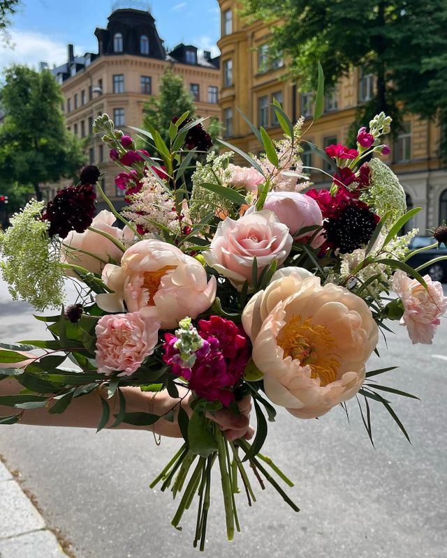 Skicka Floweropens signatur bukett som blombud. Buketten är vackert bunden med Floweropens val av säsongens blommor som går i creme, rosa, vinrött och andra fina blommor.
