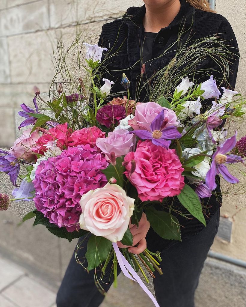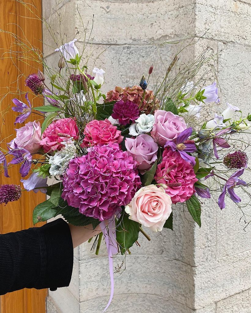 En exklusiv höstbukett i romantiska toner av lila, rosa och vinrött. Fylld med hortensia, rosor och andra säsongsblommor som sprider både värme och elegans. Perfekt som gåva eller för att förgylla ditt hem under hösten.