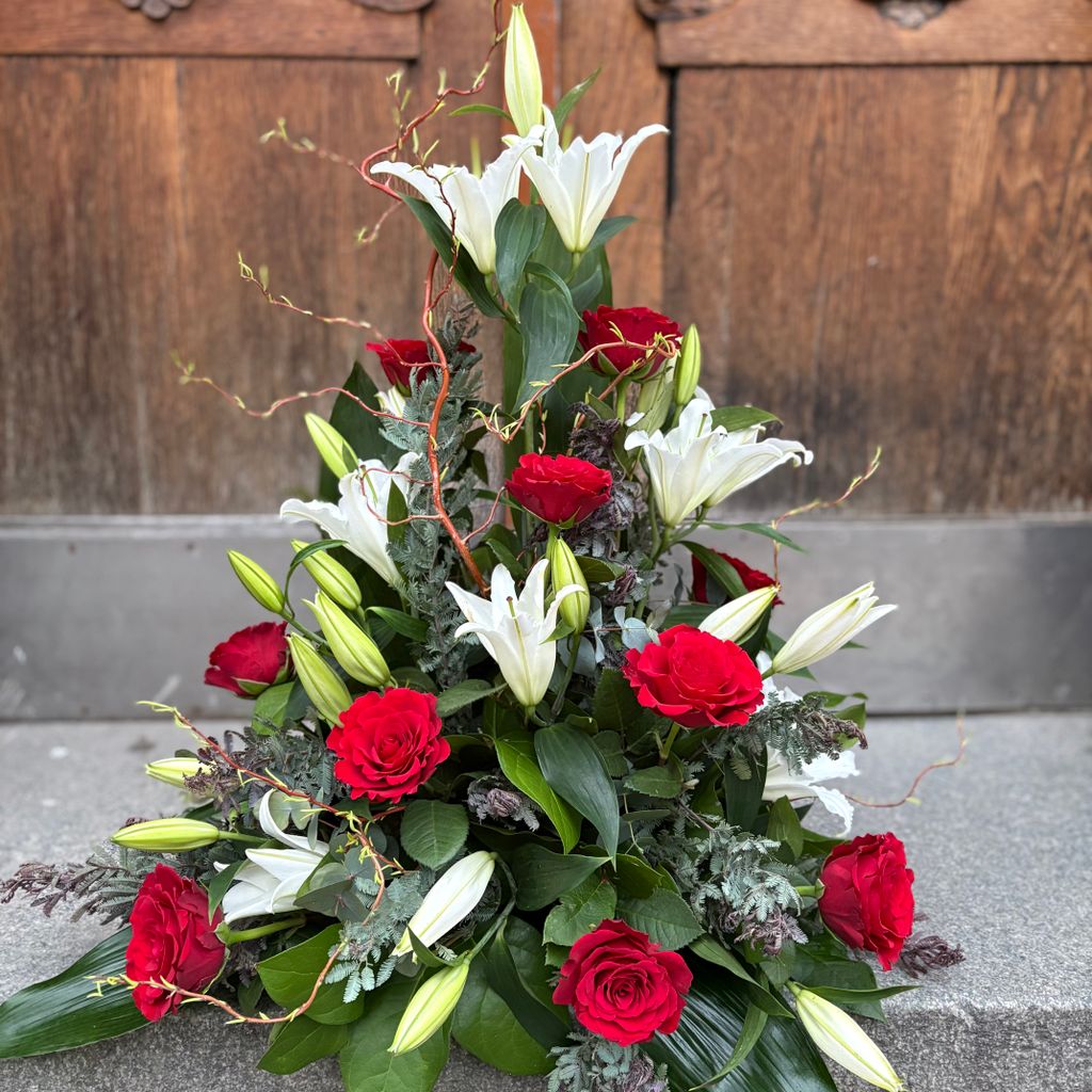 En klassisk hög begravningsdekoration med djupröda rosor och vita liljor och andra blommor tillsammans med gröna blad.