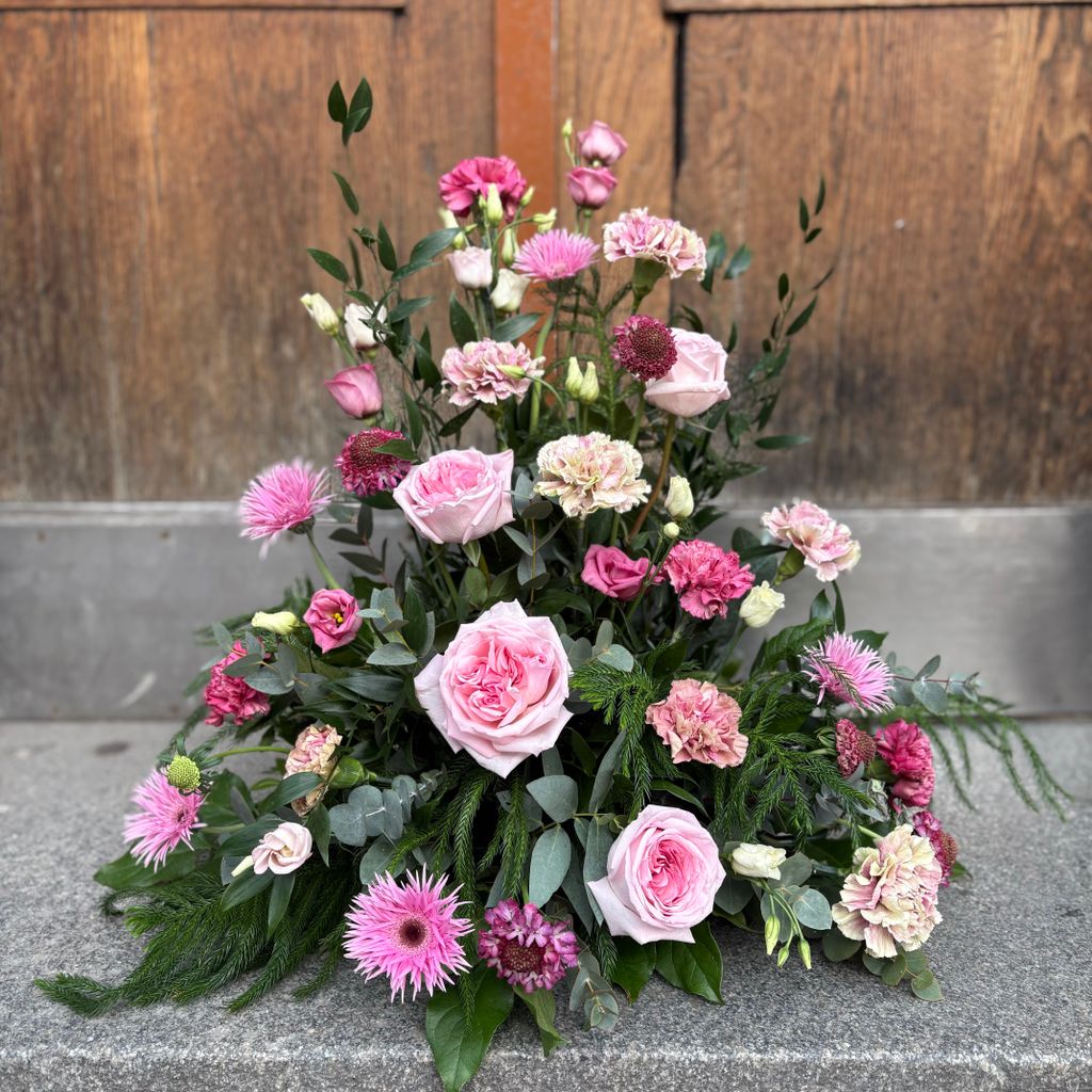 Stående begravningsdekoration i rosa färger, noggrant arrangerad för en vacker och personlig hyllning. Levereras med din hälsning på ett textat kort eller passande band. Handbuketter kan beställas för leverans till begravningsplatsen.