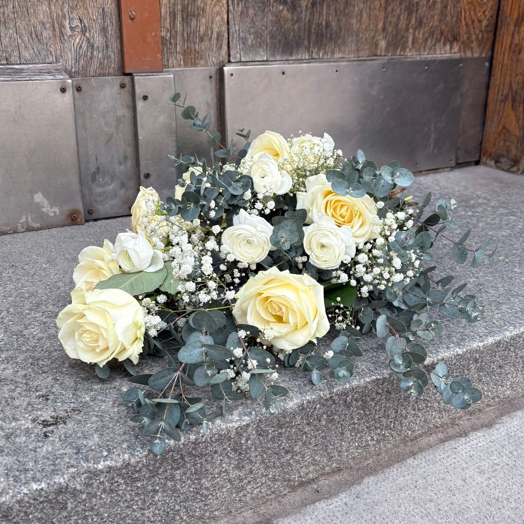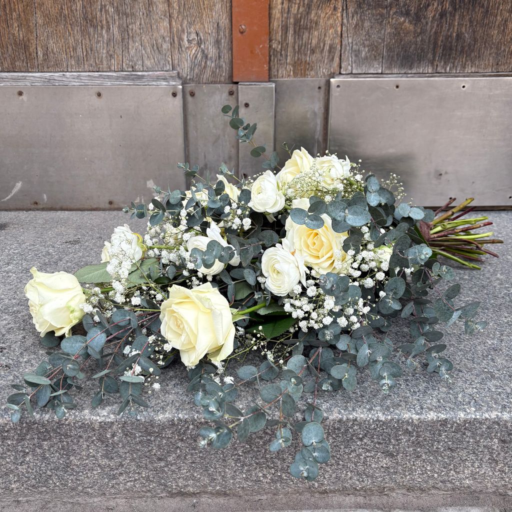 En klassisk liggande bukett med vita blommor och vackert grönt.