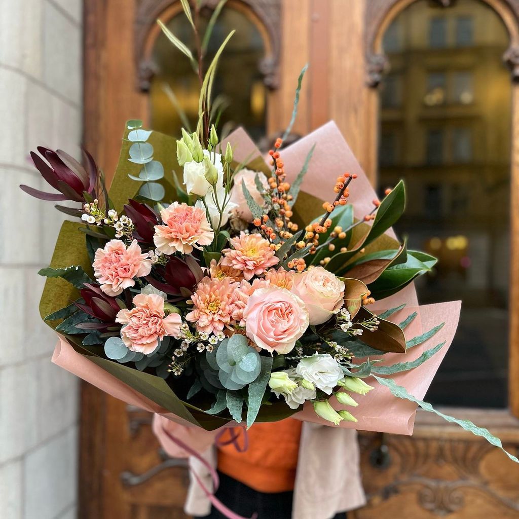 Observera att bilden är en exempelbukett och att blommorna varierar efter säsong.