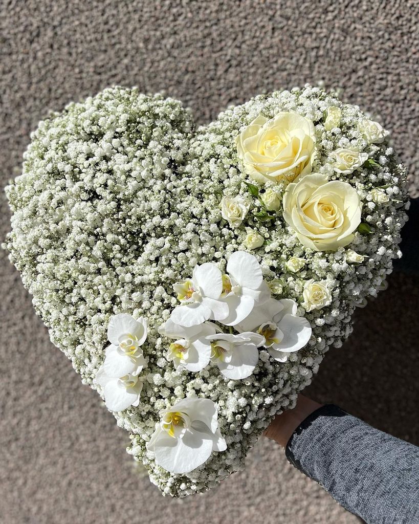 Ett vackert fyllt hjärta med brudslöja, orkidéer och rosor i olika vita nyanser. Perfekt för att uttrycka respekt och medkänsla. En vacker och stillsam hyllning, noggrant utvald av våra florister.